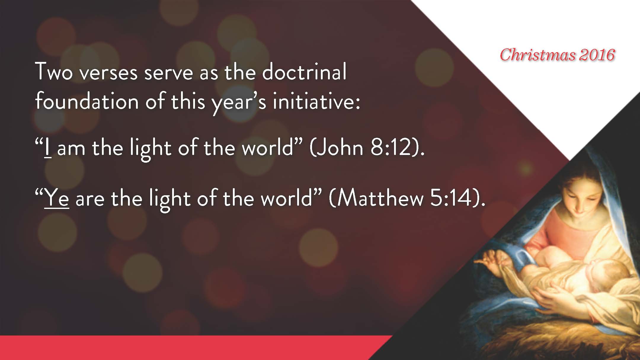 This year’s initiative is entitled #LIGHTtheWORLD. It focuses on celebrating and sharing the Light of Jesus Christ with others. The initiative begins Friday, November 25, 2016 and runs through Christmas Day.