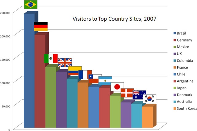 The top 12 country sites in 2007, in terms of unique visitors, are shown in the graph below.