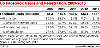 By 2013, 62% of web users and almost half of the overall US population will be on Facebook.