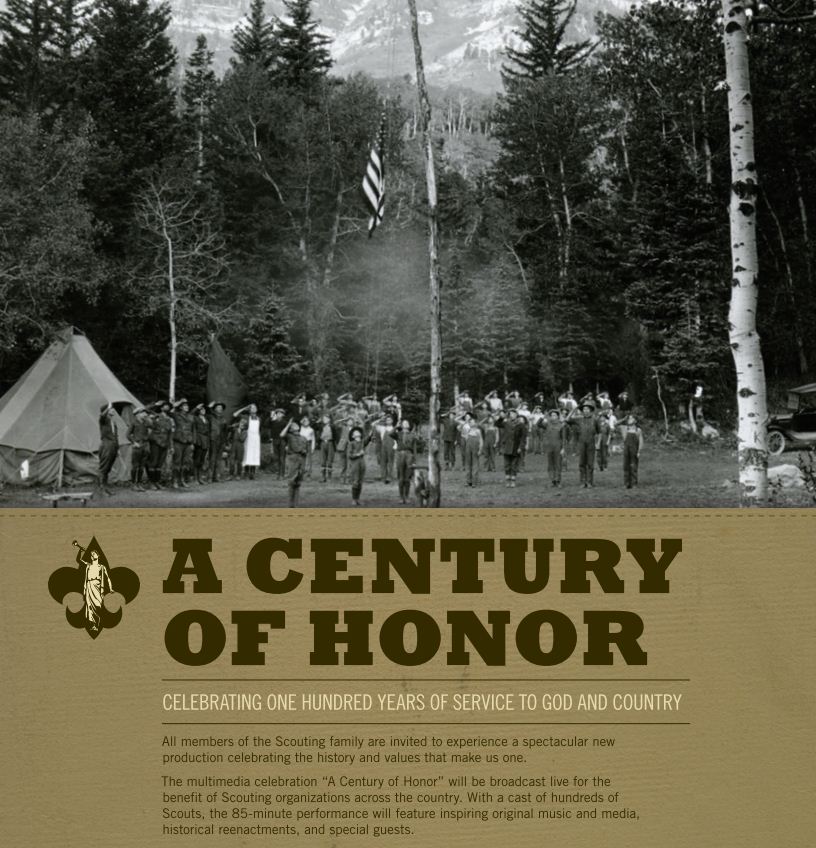 To commemorate the 100th anniversary of the partnership between The Church of Jesus Christ of Latter-day Saints and the Boy Scouts of America, a special tribute to Scouting, A Century of Honor, will be broadcast via satellite from the LDS Conference Center on Tuesday, October 29, 2013, at 7:00 p.m. MDT.