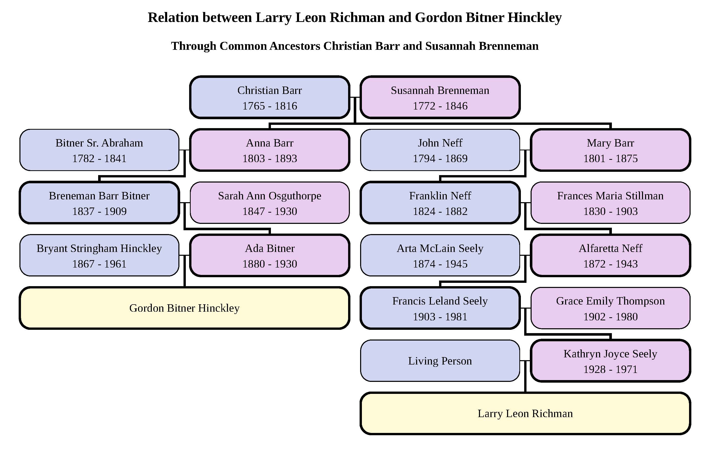 I learned that President Gordon B. Hinckley is my 3rd cousin twice removed. Below is the chart the system provided me: