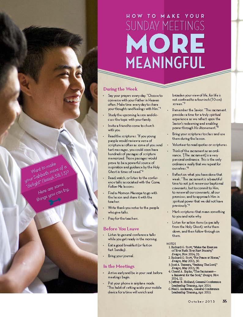 This month, the New Era magazine has published a helpful article “How to Make Your Sunday Meetings More Meaningful.” It gives preparation ideas for during the week, ideas on what to do Sunday mornings before you to to your meetings, and ideas for what to do during the meetings.