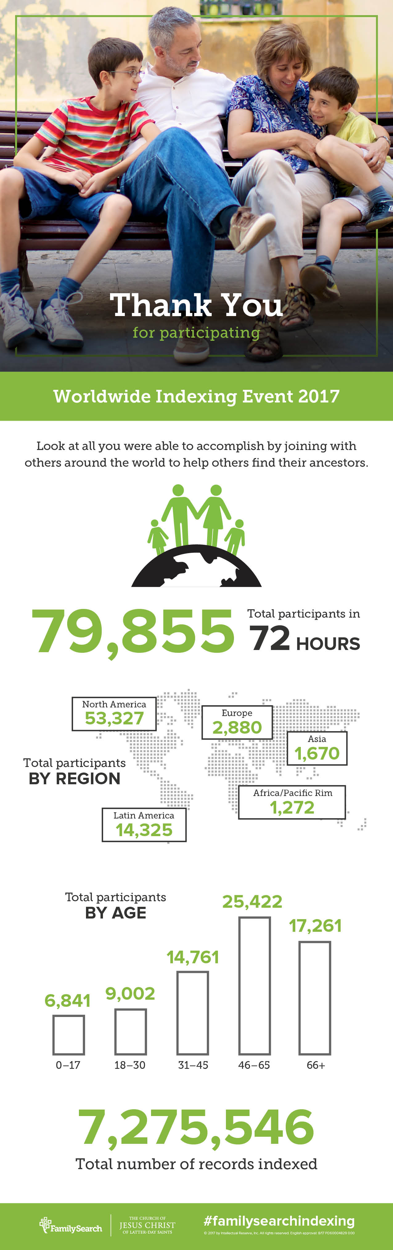 7,275,546 records were indexed in 72 hours during FamilySearch’s Worldwide Indexing Event held October 20–22, 2017. Thanks to the nearly 80,000 volunteers around the world who transcribed historical documents to make them searchable online.