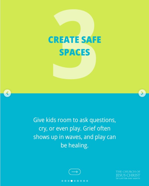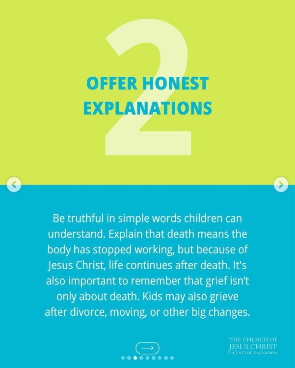 2. Offer honest explanations. Be truthful in simple words children can understand. Explain that death means the body has stopped working, but because of Jesus Christ, life continues after death. It’s also important to remember that grief isn’t only about death. Kids may also grieve after divorce, moving, or other big changes.