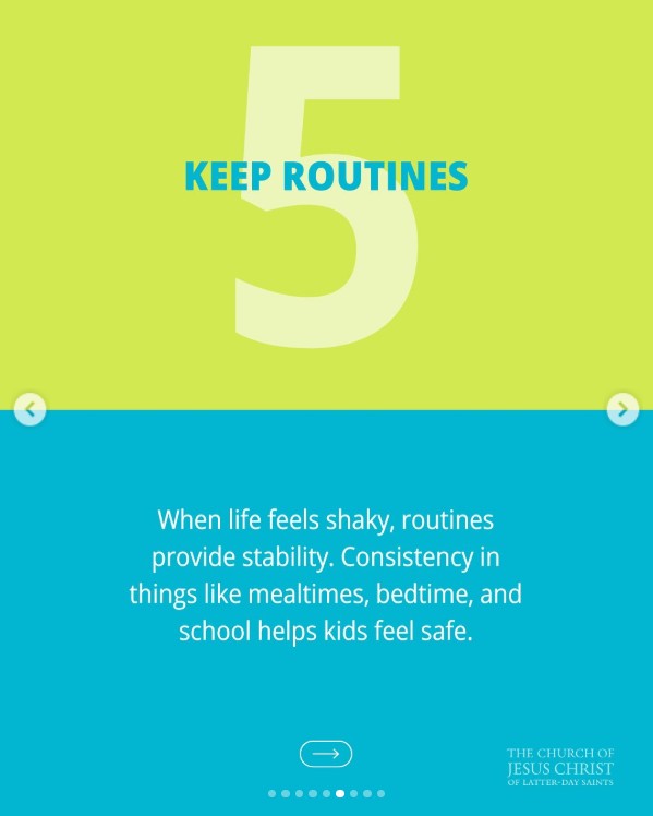 5. Keep routines. When life feels shaky, routines provide stability. Consistency in things like mealtimes, bedtime, and school helps kids feel safe.