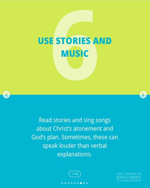 6. Use stories and music. Read stories and sing songs about Christ’s Atonement and God’s plan. Sometimes, these can speak louder than verbal explanations.