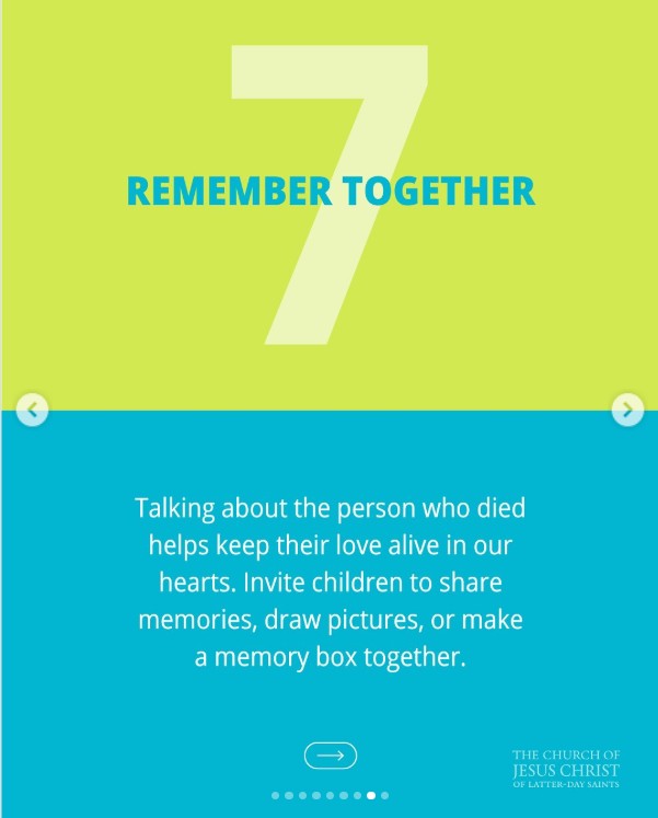 7. Remember together. Talking about the person who died helps keep their love alive in our hearts. Invite children to share memories, draw pictures, or make a memory box together.