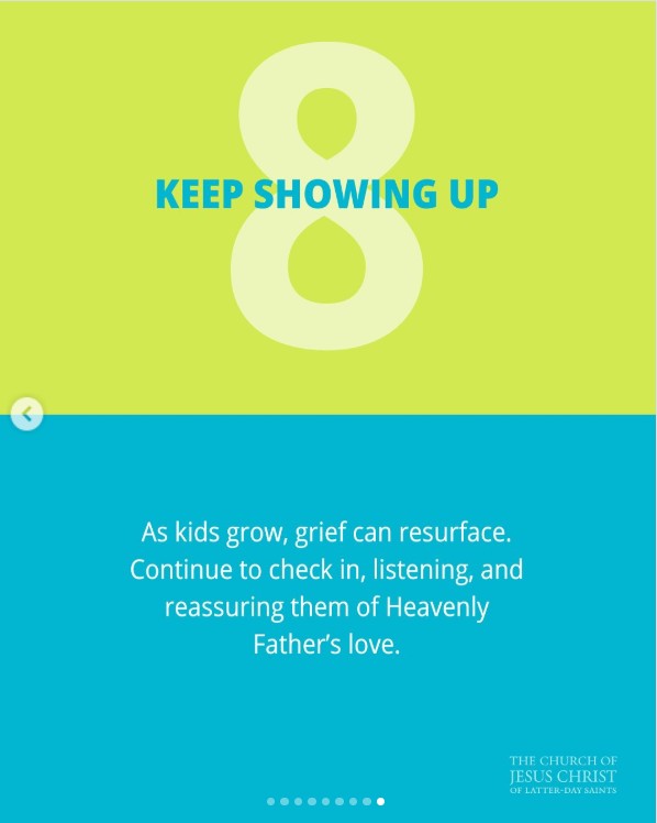 8. Keep showing up. As kids grow, grief can resurface. Continue to check in, listening, and reassuring them of Heavenly Father’s love.